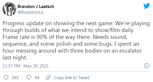 Stress Level Zero聯(lián)合創(chuàng)始人Brandon Laatsch在其個(gè)人推特透露了新游最新進(jìn)展,并表示工作室每天都在測(cè)試新游內(nèi)容,其甚至“親自上陣殺敵,并在一個(gè)自動(dòng)扶梯上干掉了三個(gè)敵人”。