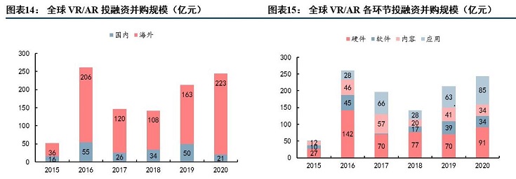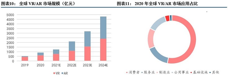 近年來,隨著VR/AR技術(shù)的突破發(fā)展以及消費(fèi)需求的強(qiáng)勁增長(zhǎng),VR/AR行業(yè)提速明顯,迎來了新的拐點(diǎn)。2020年以來,VR/AR終端設(shè)備的出貨量明顯加速增長(zhǎng)。研機(jī)構(gòu)DC數(shù)據(jù)顯示,未來三年VR/AR行業(yè)復(fù)合增長(zhǎng)率超過80%。據(jù)測(cè)算,全球VR/AR市場(chǎng)規(guī)模接近千億,AR與內(nèi)容應(yīng)用成為首要增長(zhǎng)點(diǎn),預(yù)計(jì)2024 年將達(dá)到近5000億元。此外,卷土重來的VR/AR賽道熱度同樣投射到資本市場(chǎng)的投融資規(guī)模上。據(jù)了解,2020年VR/AR投融資規(guī)模達(dá)到244億元,投融資并購發(fā)生219起,實(shí)現(xiàn)連續(xù)三年上漲。其中,在2020年和2019年的融資并購案例中,AR眼鏡領(lǐng)域的并購金額居于首位。