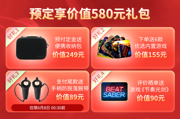NOLO Sonic售價1999元,是全球首款2000元以內(nèi)的6DoF VR一體機(jī),618期間預(yù)定的用戶可享580元好禮,下單即贈送價值155元的內(nèi)置游戲6款,不乏像「節(jié)奏拳擊」、「X-燃脂源動力」這樣從Quest移植的優(yōu)秀作品。除此之外用戶曬單還可獲得價值90元的爆款音游「節(jié)奏光劍」等多重好禮(具體以電商頁面信息為準(zhǔn))。