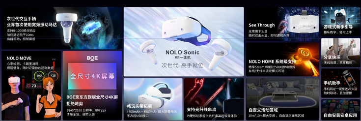 今年5月,NOLO VR在北京召開發(fā)布會,發(fā)布了旗下首款I(lǐng)nside-out VR一體機(jī)NOLO Sonic,搭載BOE無裁剪全尺寸的真4K屏幕,分辨率3840*2160,PPI為807。相較于其他同類VR一體機(jī)采用的3664*1920分辨率、PPI 773裁剪版屏幕,可謂是更勝一籌。