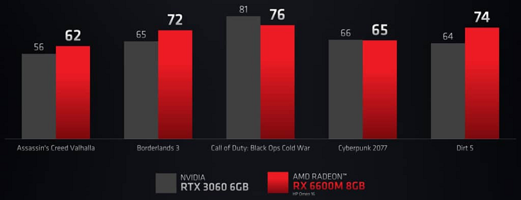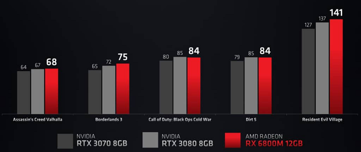通過(guò)「刺客信條:英靈殿」、「使命召喚」等游戲測(cè)試對(duì)比圖,我們可以看到RX 6000M性能與 NVIDIA RTX 3060M大致相當(dāng)、RX 6800M性能約等于NVIDIA RTX 3080M。