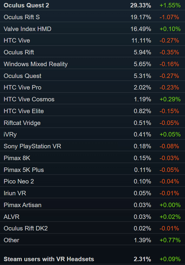 整體來看,有59.77%來自O(shè)culus,其中,Quest 2繼續(xù)高歌猛進(jìn),以29.33%(+1.55%)的份額遙遙領(lǐng)先。Rift S、Rift以及Quest均出現(xiàn)一定程度的份額下滑,最新占比分別為19.17%(-1.07%)、5.94%(-0.35%)和5.31%(-0.27%)。