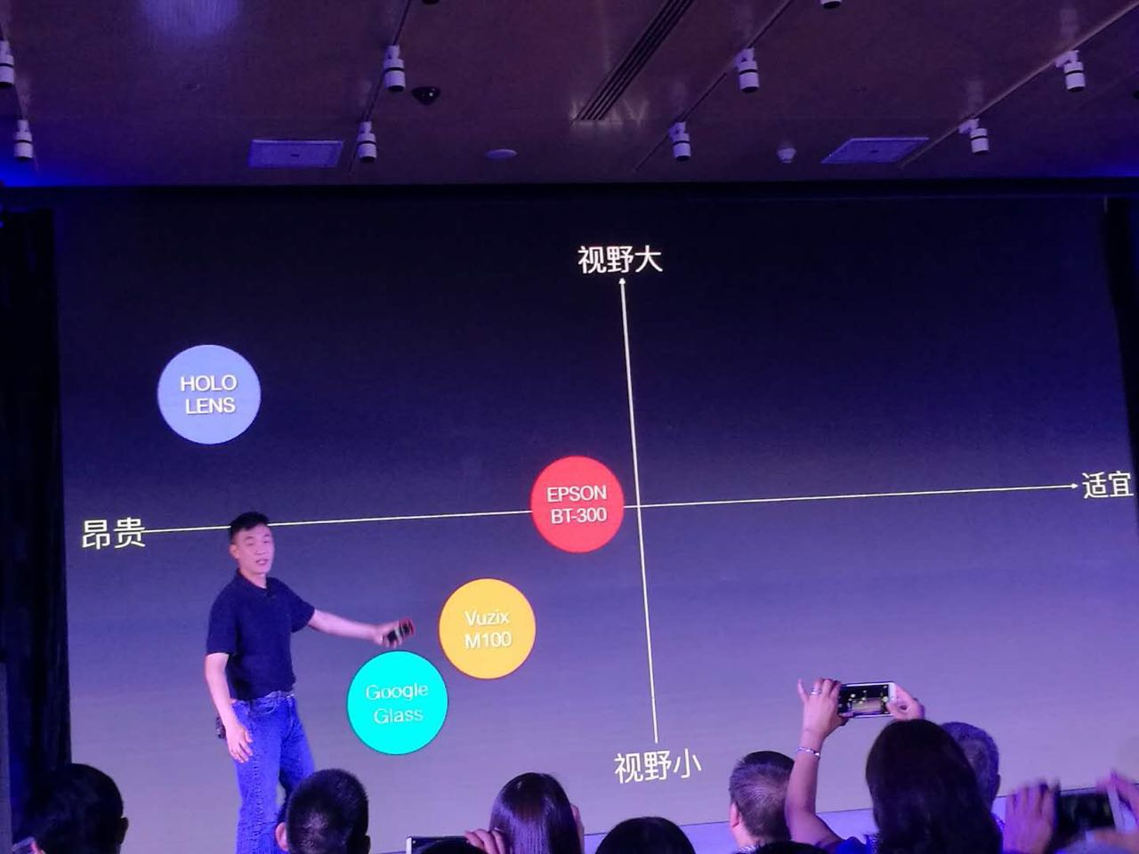 在對最后一款新品的描述中,孫立前后用了兩個描述:一款與眾不同的AR設備/一款與眾不同的VR設備。沒錯,這不是口誤,而是本次發(fā)布會的壓軸黑科技產(chǎn)品,可以在AR和VR之間切換的全新一代VR設備HALO。 HALO具有通過自由曲面的光學設計,達到了70的Fov,它可以看到虛擬的物體,也可以看到真實的物體;采用1000Hz高精度陀螺儀,延遲低至13毫秒。性能上,采用820處理器,采用最強勁的ARM架構,最好的移動顯示處理單元。只有1.5毫米的超薄鏡片也讓它顯得格外與眾不同。在系統(tǒng)上,HALO基于全新一代安卓最新的系統(tǒng)去定制,保證其裝載非常多的功能以后,依然可以達到很低的顯示與傳感器的延遲。 HALO支持gesture,直接可以用手去控制VR設備,還支持深度的手勢識別。而在slam上,是實時地圖構建的縮小。 一般的SLAM實現(xiàn)方式有兩種,一個是由內(nèi)而外的定位,一個是由外而內(nèi)的定位。HTC打造的Lighthouse,銷量和市場表現(xiàn)非常不錯,因為它是消費者唯一能夠買到、戴著頭盔能夠自由走動,并且在虛擬世界中也能自由走動的VR設備,而如果買暴風就完全都做不到這樣的效果,只能戴著頭盔原地轉,完全無法進行走動。所以HTC通過兩個激光卡來解決了這個問題。 還有一種解決方式叫做MARKER ROOM,很多大型的體驗店是這樣解決的,通過VR頭盔的感應器感應到周邊的紅外光源的控制進行定位,佩戴者在光源點上走路的時候會有感覺。但是這些定位方式都有一個致命的問題,就是需要布置設備。例如,HTC需要布置兩臺激光塔,它的范圍是有限的,必須在10米之內(nèi)行走。MARKER ROOM需要擴大范圍,這樣的場景非常適合C端使用。 而HALO使用的SLAM技術不需要任何的外部定位設備,只需要VR頭盔我們可以在虛擬空間進行行走,不需要任何其他配置,非常方便。除了可以在虛擬世界中行走之外,它同時還對空間進行建模,來提示是否被物品遮擋,是否需要小心等等,HALO都可以做到。所以說HALO提供的SLAM技術是不需要任何外部檢測設備,也不需要任何識別物,就能提供全面的位置追蹤。 之所以稱HALO為黑科技,一個原因是因為它的外觀非常黑。HALO的鏡片表面上采用了全新的材料,它可以做到一鍵切換成AR,也就是前文所述的一款集AR、VR于一體的全新設備。 這款超越想象的智能眼鏡的定價顯然是大家非常關心的問題。在公布產(chǎn)品價格之前,孫立先賣了個關子,談到了研發(fā)HALO過程中受到的質疑。“大公司它都沒有做的很好,我們這樣小的研發(fā)團隊,憑什么能做到?”孫立說,這是一種錯誤的想法或者說是一種非常慣性的思維。經(jīng)過兩年的摸索,孫立和影創(chuàng)團隊發(fā)現(xiàn),一切事情都可以想辦法去做,并且去付諸實踐,任何困難都是可以被攻克的。