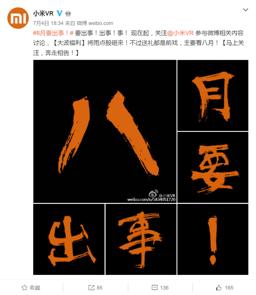 經(jīng)過多方渠道確認(rèn),小米VR很大可能就是會在今年的8月份推出。沉寂已久的“小米VR”官方認(rèn)證微博自從6月27號發(fā)布第一條微博后,在期間又發(fā)布了一條“八月要出事”的微博,看來“大事”即將來臨。