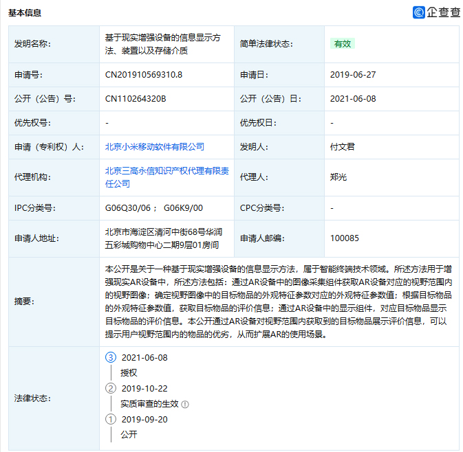 企查查App顯示,北京小米移動軟件有限公司日前獲得“基于現(xiàn)實增強設(shè)備的信息顯示方法、裝置以及存儲介質(zhì)”專利授權(quán),該專利于2019年6月27日申請,公開(公告)號為CN110264320B。