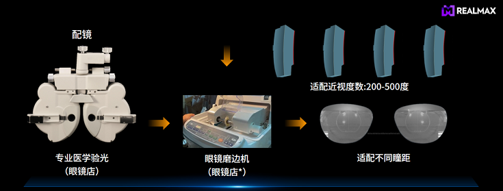 那么“REALSEER·PRO”不僅真眼鏡、大視角、輕、薄、纖細外,還要讓人真正看得清戴得舒服,用戶可以在指定的眼鏡店通過專業(yè)的光學驗光,測量出自己的左右眼近視度數(shù)(200°-500°內),然后選擇“REALSEER·PRO”專用鏡片,在配合瞳距、瞳高和鏡框形狀,用專業(yè)眼鏡店的鏡片磨邊機打磨好鏡片,再裝配整機,像專業(yè)處方眼鏡配鏡那樣給用戶個人定制化最適合的AR眼鏡。