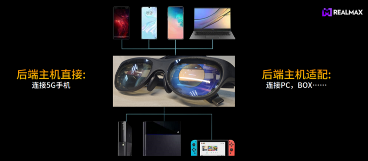 在“REALSEER·PRO”眼鏡鏡腿末端有USB Type-C接口,可以直接連接高端帶DP的5G 手機,享受5G的低延遲高帶寬,也可以連接電腦或通過轉接器連接各種游戲機,讓你已有的內容直接投屏眼鏡。