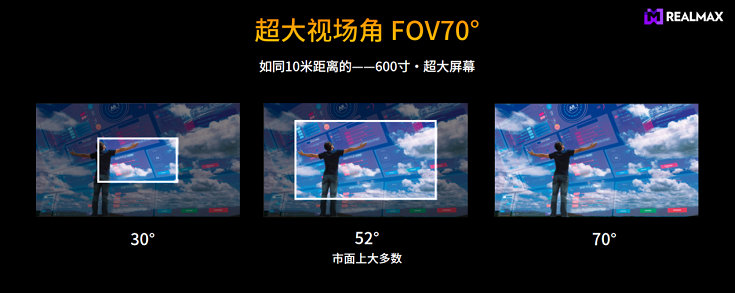 在看不出是智能眼鏡的輕薄而普適的外觀下——藏匿著先進的黑科技:波導混合多折返光學,REALMAX將“REALSEER·PRO”的可視角做到了70°,保障了其作為AR眼鏡必須具備的性能。這樣的大可視角幾乎要比當前市場上大部分僅30-55°可視角的AR設備可視面積要大出一倍,視覺效果與10米距離的——600寸超大屏幕無異,能保障人們在使用它的時候享受到優(yōu)質的沉浸高清體驗。