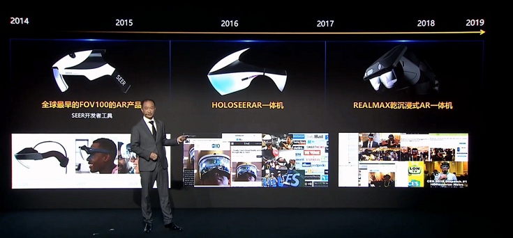 在演講中衛(wèi)榮杰先生對(duì)REALMAX歷來(lái)的產(chǎn)品做了簡(jiǎn)單介紹,其中重點(diǎn)談到了REALMAX乾量產(chǎn)于歌爾世界頂級(jí)ARVR代工廠,F(xiàn)acebook(Oculus)VR、Sony PS VR、聯(lián)想AR等產(chǎn)品都出自這里。REALMAX乾量產(chǎn)至今三年有余,其119.5°超大視角仍未被超越,加上6DOF追蹤定位和手柄手勢(shì)交互,真正實(shí)現(xiàn)了沉浸式AR的體驗(yàn),這也正是能滿足華為在峰會(huì)現(xiàn)場(chǎng)的AR大視角特效的研發(fā)需求。
