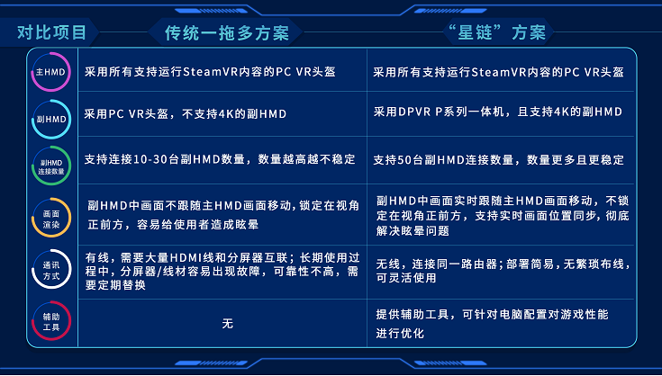 “星鏈”解決方案是一項將VR軟件與硬件相結合的成套解決方案。“星鏈”通過無線局域網將演示者的PC VR內容高清同屏到多臺一體機中,使一體機佩戴者獲得清晰的沉浸式第一視角體驗。據介紹,與一個月前發(fā)布時相比,目前“星鏈”解決方案中可同屏顯示的一體機數量,已經突破了之前的30臺上限,達到了50臺,并在未來可實現“多拖多”方案,也就是可以做到多位演示者的PC VR內容高清同屏到多臺一體機中。