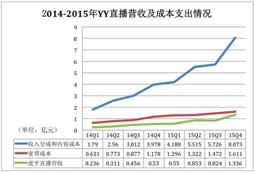 歡聚時代財報顯示,YY近兩年寬帶成本支出一直在增長,從2014年第一季度到2015年第四季度,YY直播僅寬帶成本就增加了近1億元。2015年YY直播每個季度的寬帶成本都在1億元以上,平均每個月投入4750萬元。