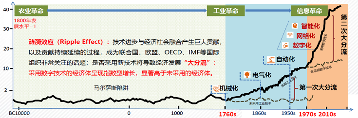 ??從這張圖上可以看到,上個(gè)世紀(jì)工業(yè)技術(shù)被采用后,工業(yè)的發(fā)展是指數(shù)型的;數(shù)字化和智能化的技術(shù)被采用后,工業(yè)再次迎來(lái)了一個(gè)指數(shù)型發(fā)展的階段。如果不采用新技術(shù),工業(yè)就會(huì)被分流,兩次大分流改變了整個(gè)世界的格局,改變了國(guó)家在世界中的位置,改變了產(chǎn)業(yè)、企業(yè)、區(qū)域甚至個(gè)人的生產(chǎn)方式??梢钥闯?,工業(yè)的大規(guī)模發(fā)展對(duì)當(dāng)今的社會(huì)局勢(shì)以及復(fù)雜國(guó)際形勢(shì)的影響,其中緣由都來(lái)自技術(shù)所引起的世界格局的變化。