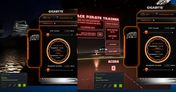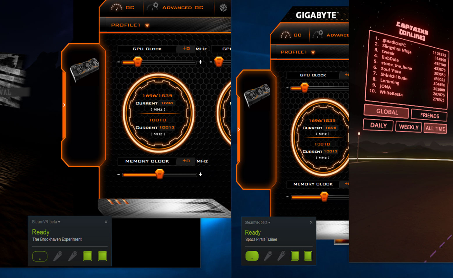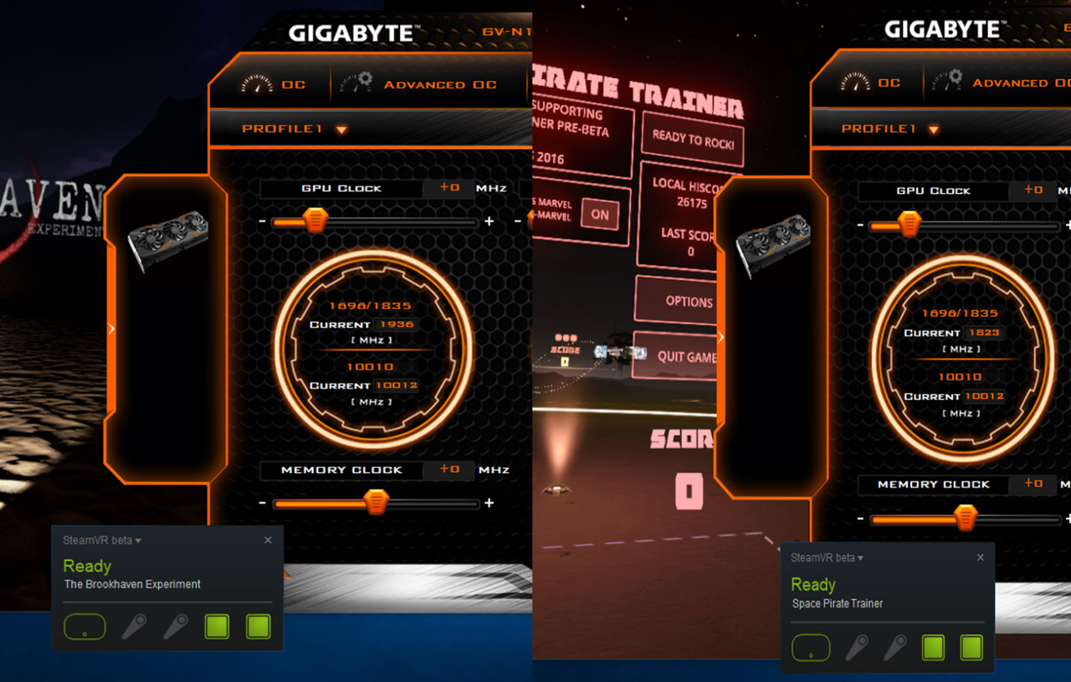 我們抽取測試了兩個(gè) SteamVR 游戲《太空海盜》和《布魯克海文實(shí)驗(yàn)》,一個(gè) Rift 游戲《幸運(yùn)的故事》,還測試了 Unigine Heaven(顯卡測試軟件,以其高負(fù)載、高壓榨而知名)。我們使用技嘉的 GTX 1080 G1 Gaming 和 GTX 980 Ti Xtreme Gaming 這兩張顯卡做測試比較。