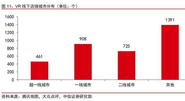 我們通過騰訊地圖、大眾點(diǎn)評等平臺(tái)獲取了VR、虛擬現(xiàn)實(shí)相關(guān)的線下門店數(shù)據(jù),截至2021年6月共計(jì)3486家,其中北上廣深超一線城市占比13%,一、二線城市共占47%,低線城市占40%。表明當(dāng)前VR店鋪在下沉市場滲透率已經(jīng)較高,但店鋪密度低,單店熱度有限。