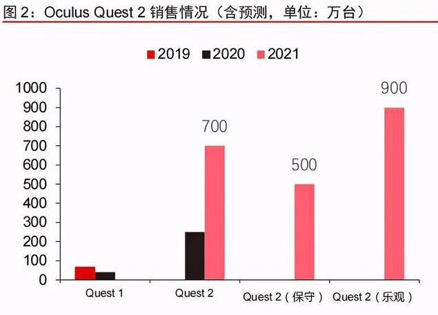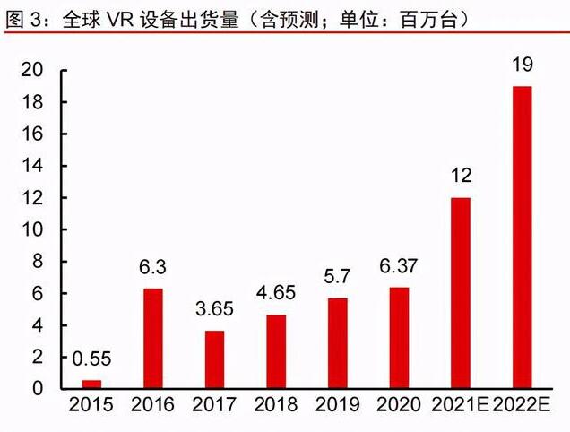 2018年以來,頭部廠商的VR產(chǎn)品迭代速度加快,在硬件設(shè)備核心技術(shù)革新推動(dòng)下,市場主流產(chǎn)品轉(zhuǎn)向高端一體機(jī)和PC VR頭顯設(shè)備,同時(shí)伴隨著市場出清、內(nèi)容積累,VR產(chǎn)業(yè)發(fā)展逐步回暖。在2020年10月Oculus推出的標(biāo)志性產(chǎn)品Quest 2,僅兩個(gè)月銷量達(dá)110萬臺(tái),極大的拉動(dòng)了設(shè)備出貨量快速增長,2020年設(shè)備出貨量為637萬臺(tái),與2016年整體持平,但是行業(yè)生態(tài)得到有效改善,整體進(jìn)入“硬件性能提升——用戶群體擴(kuò)大——內(nèi)容供給增多”的良性循環(huán),預(yù)期2021年整體銷量有望達(dá)到千萬級別,若僅考慮其中VR硬件的市場規(guī)模,預(yù)計(jì)2022年VR設(shè)備出貨量可達(dá)1900萬臺(tái),按單機(jī)價(jià)格4000元計(jì)算,市場規(guī)模約760億元。