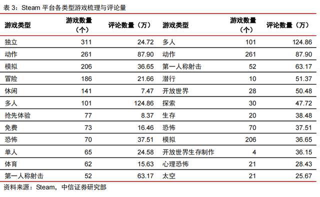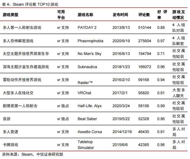 頭部游戲中,自帶著名IP游戲入場有效牽引主機(jī)游戲玩家群體,加速VR產(chǎn)業(yè)發(fā)展。在評論數(shù)TOP10的游戲中,已經(jīng)出現(xiàn)了兩款高知名度IP,分別是古墓麗影系列和半條命,尤其“Half-Life:Alyx”作為VR獨(dú)占游戲,依賴其精良的制作和超高的號(hào)召力,引發(fā)了一大波VR購機(jī)熱潮,游戲好評率更是達(dá)到99%,有效的將主機(jī)游戲玩家牽引至VR平臺(tái)。同時(shí)“Half-Life:Alyx”的成功也意味著第一人稱射擊類游戲在VR平臺(tái)上已可以獲取良好的體驗(yàn),伴隨著游戲工坊等MOD設(shè)計(jì)功能向玩家開放,我們可以期待“反恐精英”這類強(qiáng)社交模式的爆款射擊游戲隨之出現(xiàn)。