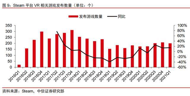 Steam平臺(tái)新發(fā)布VR相關(guān)游戲好評率持續(xù)走高,玩家體驗(yàn)逐年改善。在VR相關(guān)游戲在評論數(shù)大于100條的游戲中,每年發(fā)布的VR游戲平均好評率從2016年起呈現(xiàn)逐年增加趨勢,2016年發(fā)布的游戲好評率為80%,2020年發(fā)布的游戲好評率為95%。整體來看,新發(fā)布的VR游戲質(zhì)量、內(nèi)容和可玩性都有所提高,玩家對游戲反饋逐漸好轉(zhuǎn),從而有效提高VR游戲的用戶黏性,有望帶動(dòng)VR設(shè)備需求。