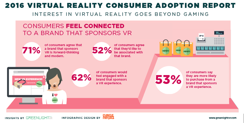 在受訪者中,有71%的人認(rèn)為一個(gè)品牌對(duì)VR進(jìn)行贊助是具有前瞻性的思維,有52%的人愿意將VR和贊助品牌相聯(lián)系。除此之外,有62%的人會(huì)對(duì)有資助VR體驗(yàn)的品牌有好感,有53%的人說(shuō)他們更傾向于購(gòu)買那些有贊助過(guò)VR體驗(yàn)的品牌產(chǎn)品。