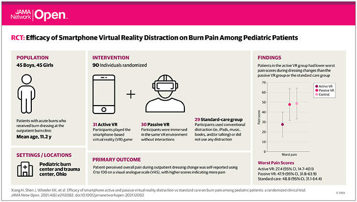 JAMA Network Open(醫(yī)學四大期刊之一JAMA的旗下子刊,是一本國際性的、經(jīng)過同行評審的、開放訪問的醫(yī)學期刊)上日前發(fā)表的一項隨機臨床試驗顯示,基于智能手機的VR游戲能夠顯著減輕燒傷患兒換藥時疼痛。