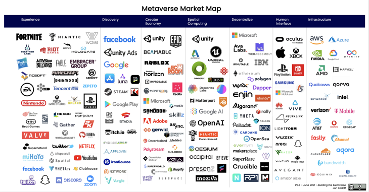 光出現(xiàn)在Newzoo和Medium的元宇宙圖譜里的公司就超過200家,其中既有《堡壘之夜》《GTA5》這樣的游戲產(chǎn)品,也有云計算和通信服務商;有直播平臺和應用商店,也有游戲引擎和數(shù)字貨幣交易所。