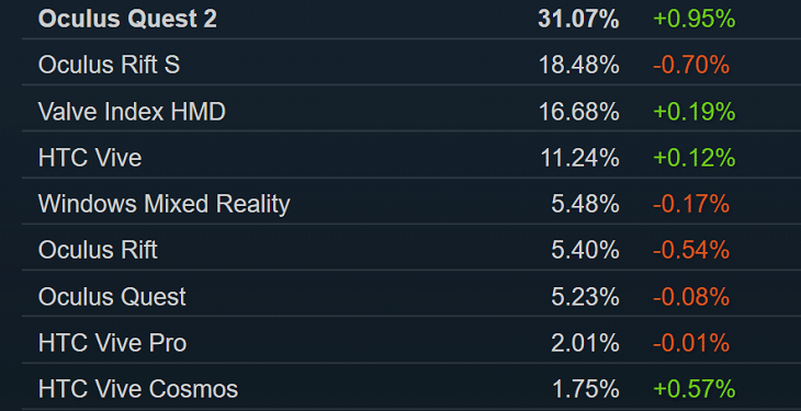 據(jù)外媒uploadVR報(bào)道,F(xiàn)acebook旗下VR一體機(jī)Oculus Quest 2在Steam平臺(tái)上的VR頭顯使用占比為31.07%,這一數(shù)據(jù)是Valve在上周末發(fā)布的,Valve發(fā)布最新數(shù)據(jù)的目的是解決本月初的數(shù)據(jù)錯(cuò)誤,Quest 2上個(gè)月在Steam增長(zhǎng)了0.95%,通過(guò)有線(xiàn)USB電纜及AirLink無(wú)線(xiàn)功能,Quest 2便能連接PC體驗(yàn)SteamVR內(nèi)容,這或許是Quest 2使用占比增長(zhǎng)的主要原因。