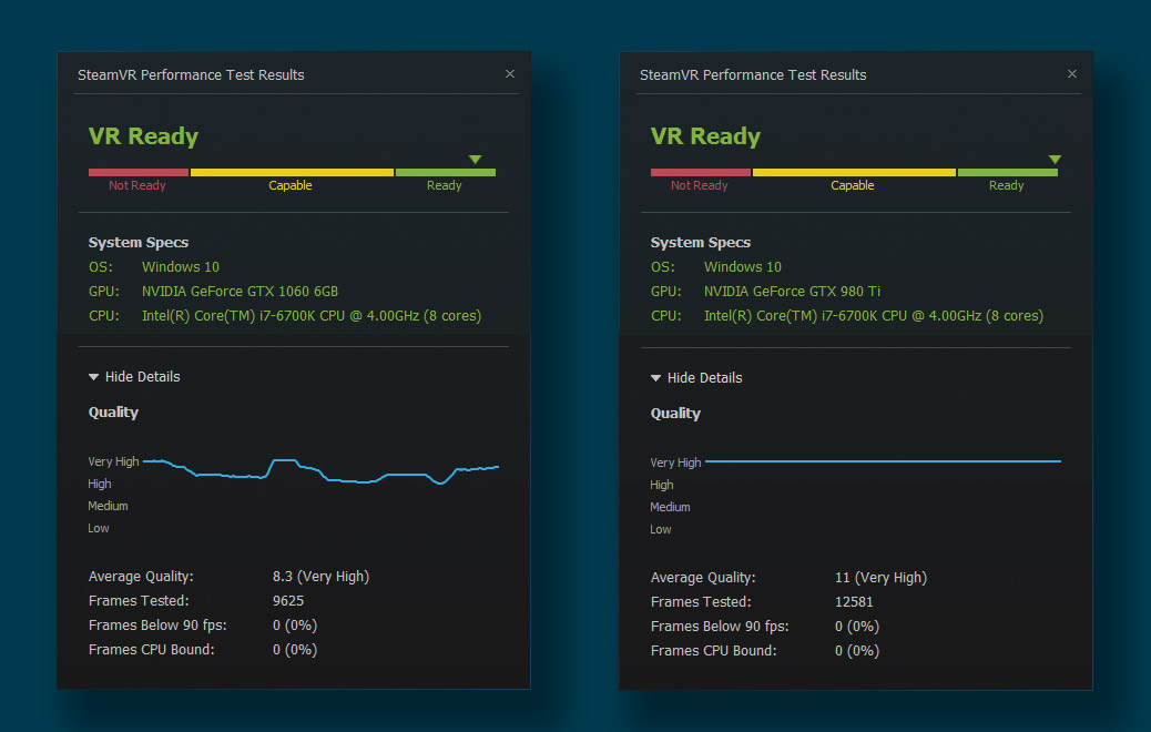 使用 SteamVR 的性能測(cè)試基準(zhǔn)對(duì)比 GTX 1060 和 GTX 980 Ti,我們可以看到 1060 得分是 8.3 分,絕大多數(shù)的質(zhì)量都保持在“非常高”的級(jí)別。而 980 Ti 得分是 11 分,測(cè)試結(jié)果顯示整體質(zhì)量都處于“非常高”的級(jí)別。