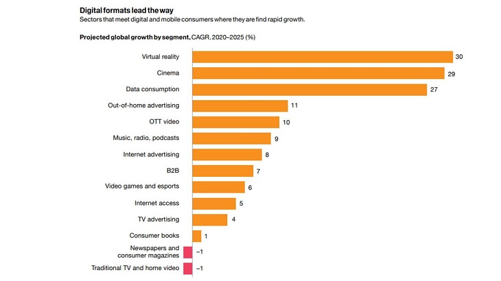 盡管VR內(nèi)容收入同比增長30%,但普華永道認(rèn)為消費(fèi)者對VR的接受度比預(yù)期的要慢,這使得VR行業(yè)更加傾向于企業(yè)級市場,隨著受到疫情影響的媒體主體逐漸恢復(fù)業(yè)務(wù),普華永道預(yù)計(jì)到2025年VR仍將是增長最快的娛樂和媒體領(lǐng)域,行業(yè)收入將以30.3%的復(fù)合年增長率(CAGR)增長至69億美元。