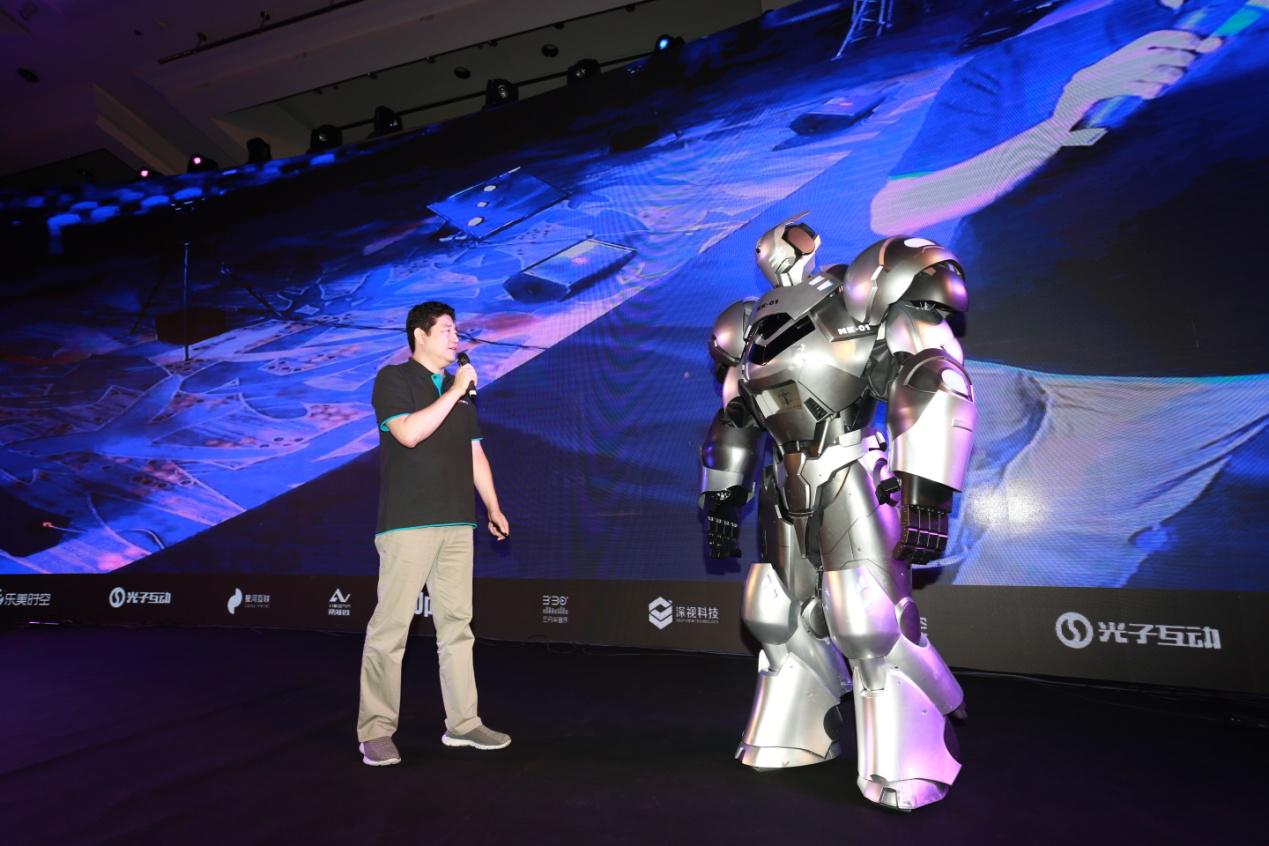 樂美時(shí)空CEO張偉與機(jī)器人對(duì)話 樂美時(shí)空CEO張偉帶著公司首款VR游戲《銀河機(jī)甲》亮相。隨后,一個(gè)兩米高全機(jī)械機(jī)器人出場(chǎng)互動(dòng),讓觀眾看到一個(gè)從虛擬游戲中走出來的機(jī)器人,頓感穿越的不真實(shí)感?!躲y河機(jī)甲》是一款VR次時(shí)代動(dòng)作射擊游戲,玩家扮演一名銀河特工,利用武器裝備殲滅巨型機(jī)甲boss,奪回母艦。目前中國VR游戲數(shù)量相對(duì)很少,高質(zhì)量的更是屈指可數(shù)。在發(fā)布會(huì)之前,《銀河機(jī)甲》就已經(jīng)與HTC、樂客、蟻視、小鳥PICO、nibiruVR等眾多線上線下企業(yè),以及國內(nèi)多家大型VR媒體、社區(qū)達(dá)成了深入合作協(xié)議。