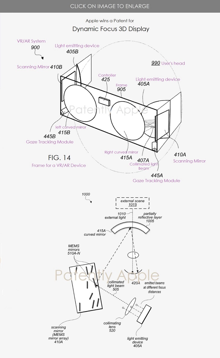 蘋果專利中使用的動態(tài)聚焦組件和技術(shù)可用于視網(wǎng)膜投影系統(tǒng),以便在將圖像掃描到用戶的眼睛時(shí)動態(tài)且正確聚焦VR圖像中的每個(gè)像素。