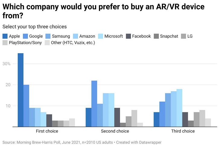 然而,將Oculus明確歸屬于Facebook旗下的策略或許適得其反,根據(jù)Morning Brew-Harris民意調(diào)查的數(shù)據(jù),消費(fèi)者對蘋果VR/AR設(shè)備表現(xiàn)出強(qiáng)烈偏好,35%的人將蘋果列為他們的首選VR/AR品牌,而Facebook這一比例僅為5%,而品牌信任調(diào)查一致表明,消費(fèi)者更信任蘋果。