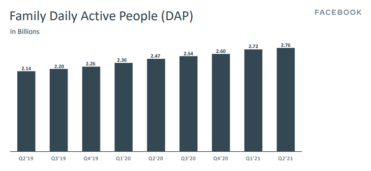 在Q2季度中,F(xiàn)acebookAPP月活用戶數(shù)量為29億,日活用戶數(shù)量為19.1億,均同比增長(zhǎng)7%,符合市場(chǎng)預(yù)期和管理層預(yù)期。主應(yīng)用、Instagram、Messenger和WhatsApp等“家族應(yīng)用群”的總月活用戶為35.1億,環(huán)比增長(zhǎng)1.7%,同比增12%,高于市場(chǎng)預(yù)期的34.9億;總?cè)栈钣脩魹?7.6億,環(huán)比增1.5%,同比增12%,高于預(yù)期的27.2億。