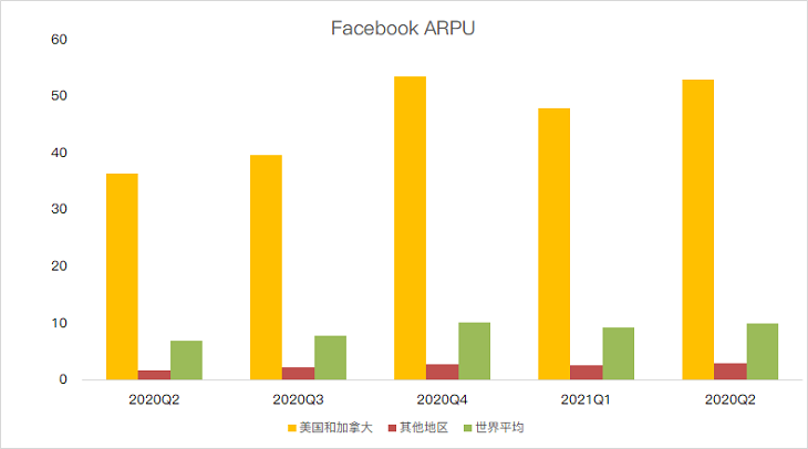 二季度,F(xiàn)acebook的ARPU值從7.05美元躍升至10.12美元,高于分析師預(yù)期的9.66美元。雖然Facebook在歐美等發(fā)達(dá)市場(chǎng)的滲透率已經(jīng)飽和,但在發(fā)展中經(jīng)濟(jì)體仍有很大的增長(zhǎng)空間,這個(gè)規(guī)律也適用于ARPU,我們看到美國(guó)和其他地區(qū)的ARPU差距非常明顯。在未來(lái),預(yù)計(jì)高增長(zhǎng)領(lǐng)域的新興市場(chǎng)的ARPU出現(xiàn)更大幅度的增長(zhǎng)。