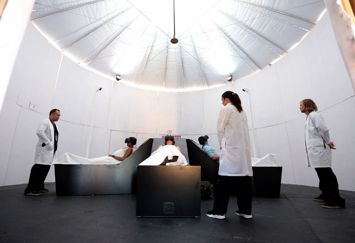 該體驗(yàn)設(shè)置在展會(huì)中心Hilton Bayfront Park公園內(nèi)的一個(gè)黑色的倉(cāng)庫(kù)。當(dāng)玩家進(jìn)入這個(gè)倉(cāng)庫(kù)之后,背后的大門(mén)會(huì)立即關(guān)閉。倉(cāng)庫(kù)內(nèi)四面都是白色的墻壁,中間位置有一個(gè)怪異的黑色平臺(tái)。身穿白色實(shí)驗(yàn)室工作服的工作人員會(huì)讓你躺在這些平臺(tái)。當(dāng)你躺下來(lái)之后,工作人員會(huì)把用在醫(yī)院的白色床單鋪開(kāi)你的身體上,給你要戴上HTC Vive頭顯和耳機(jī),然后體驗(yàn)就開(kāi)始了。