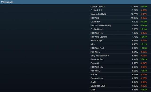 從主流游戲平臺Steam7月最新統(tǒng)計結(jié)果看,Quest2已成為該平臺32.56%VR游戲玩家的首選頭戴式設備,在一眾VR硬件設備中遙遙領先。