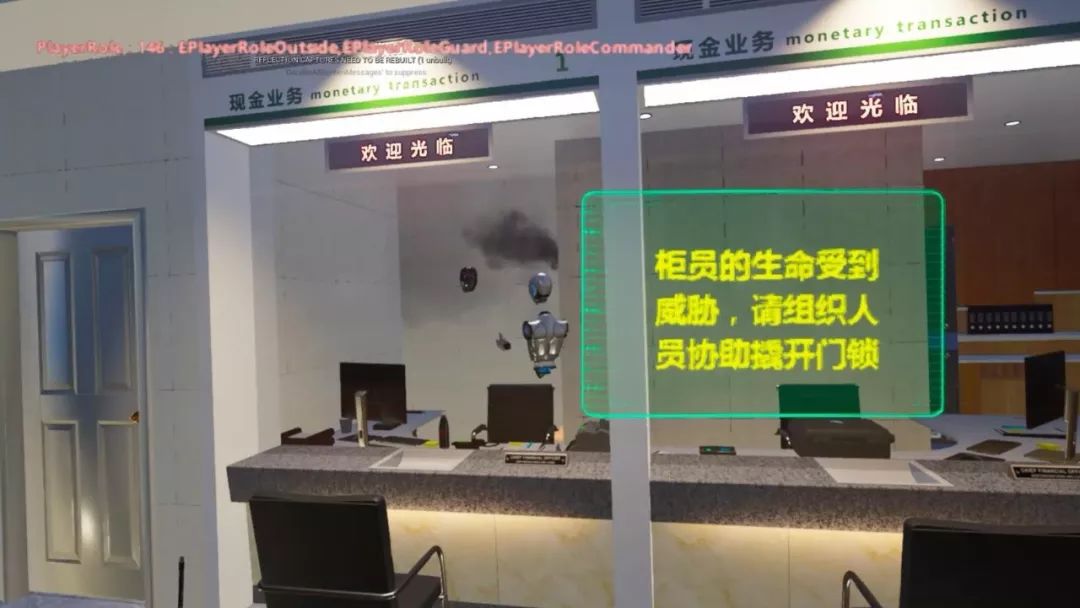 該項(xiàng)目基于REALIS瑞立視大空間VR、動(dòng)作捕捉等技術(shù),通過(guò)4種不同的角色設(shè)定(柜員、大堂經(jīng)理、保安、行長(zhǎng)),可滿足多人同時(shí)進(jìn)行體驗(yàn)。不同的角色在場(chǎng)景任務(wù)、操作內(nèi)容上相輔相成,可實(shí)現(xiàn)良好的協(xié)同訓(xùn)練效果。