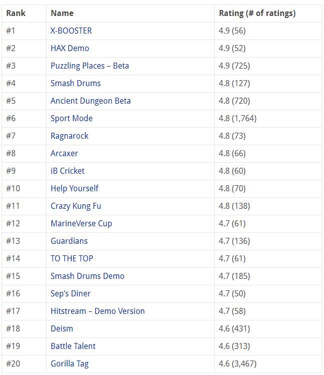 以下是App Lab平臺評分最高的20款Quest游戲