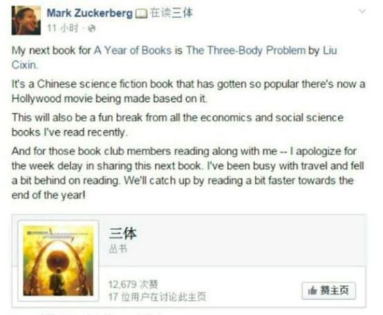 Facebook創(chuàng)始人馬克-扎克伯格撰文將《三體》列為必讀小說