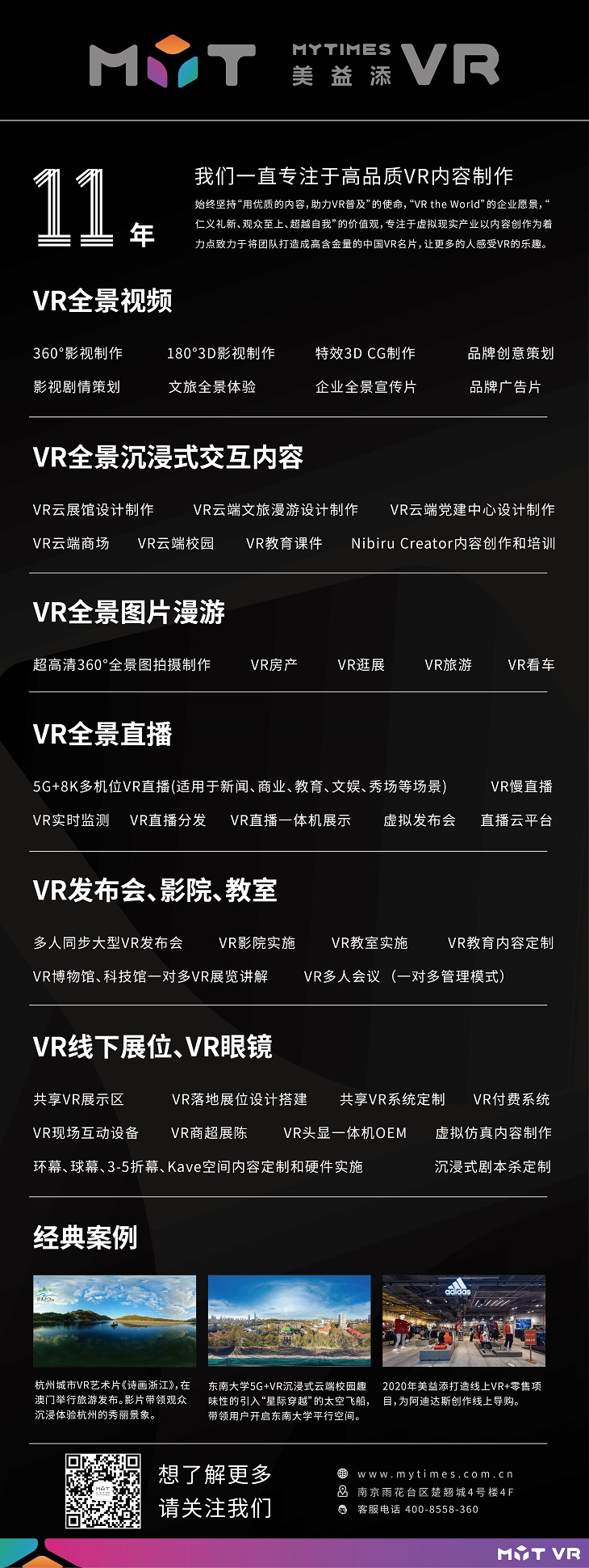 MytiemsVR,中國第一批從事虛擬現(xiàn)實(shí)產(chǎn)業(yè)的公司,國內(nèi)領(lǐng)先的VR/AR內(nèi)容服務(wù)商,擁有完整專業(yè)的VR攝制前后期團(tuán)隊(duì)。擅長把控VR內(nèi)容的品質(zhì)和藝術(shù)水準(zhǔn),是運(yùn)營商的內(nèi)容提供方,同時(shí)也是insta360、Nibiru等中國VR領(lǐng)軍企業(yè)的優(yōu)質(zhì)合作伙伴。
