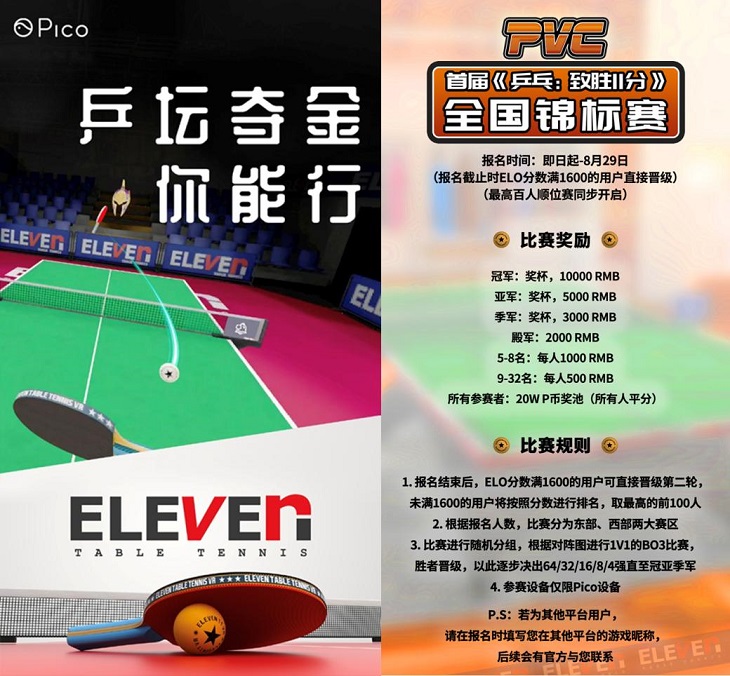 近期Pico就以《乒乓:致勝11分(Eleven Table Tennis)》為主題游戲,舉辦了PVC首屆《乒乓:致勝11分》全國(guó)錦標(biāo)賽,賽事目前仍在如火如荼地報(bào)名中。據(jù)悉,PVC 首屆《乒乓:致勝11分》報(bào)名通道開(kāi)放至8月29日,而報(bào)名截止時(shí)ELO分?jǐn)?shù)滿(mǎn)1600的用戶(hù)可直接晉級(jí),屆時(shí),最高百人順位賽將同步開(kāi)啟,本輪賽事預(yù)計(jì)持續(xù)至9月下旬。參賽選手將隨機(jī)分組,根據(jù)對(duì)陣圖進(jìn)行1vs1對(duì)戰(zhàn),采用三局兩勝制決出勝者。需要注意的是,決賽必須使用Pico Neo 3參加,沒(méi)有Pico Neo 3設(shè)備的用戶(hù),在報(bào)名開(kāi)放后可以通過(guò)租賃通道租賃設(shè)備參賽。本次賽事獎(jiǎng)勵(lì)可謂是十分豐厚,感興趣的乒乓高手們要趕快報(bào)名啦~