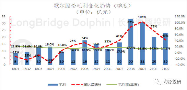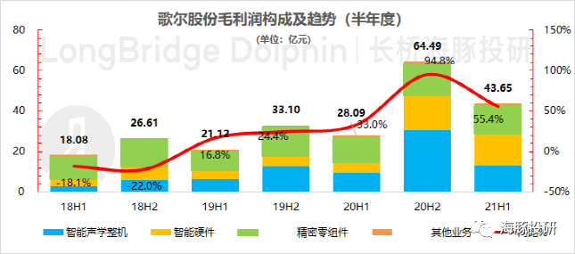 歌爾股份2021年上半年毛利潤43.65億元,同比增長55.4%。上半年整體毛利率14.4%,比去年同期下滑3.4pct,主要是由于相對低毛利率的組裝業(yè)務(wù)增加結(jié)構(gòu)性拉低了毛利率。