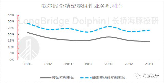 歌爾股份精密零組件板塊2021年上半年毛利率23.4%,同比減少2.8pct,環(huán)比增長1.1pct。