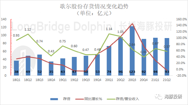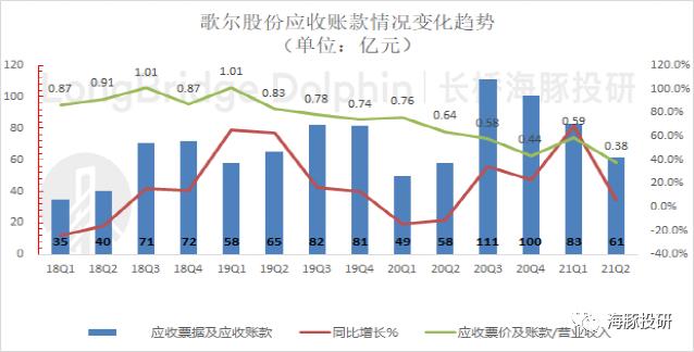 1)應(yīng)收賬款: 2021年二季度應(yīng)收賬款及票據(jù)61億元,同比增長5.9%,環(huán)比下滑26.1%,占收入比例下降到0.38。歌爾股份在逐部承接組裝業(yè)務(wù)的同時,公司應(yīng)收賬款周轉(zhuǎn)逐季改善。