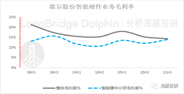 智能硬件業(yè)務(wù)毛利率仍低于公司整體毛利率,智能硬件業(yè)務(wù)的增長,結(jié)構(gòu)性拉低了公司的綜合毛利率。而同時該板塊毛利率半年度表現(xiàn)平穩(wěn)回升,給公司綜合毛利率的提供一定支撐。