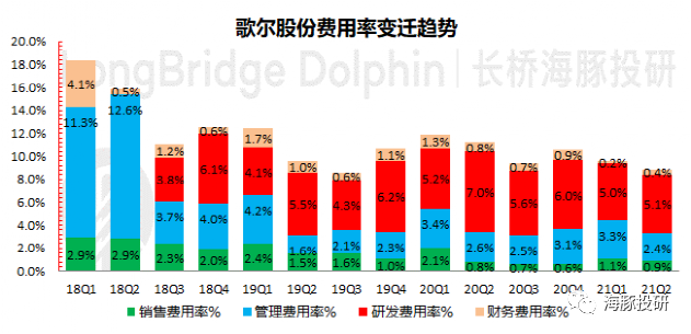 2021年二季度歌爾股份四項(xiàng)費(fèi)用合計(jì)14.41億元,同比增長41.14%,環(huán)比增長7.2%。四項(xiàng)費(fèi)用率8.9%,同比下降2.3pct,環(huán)比下降0.7pct。