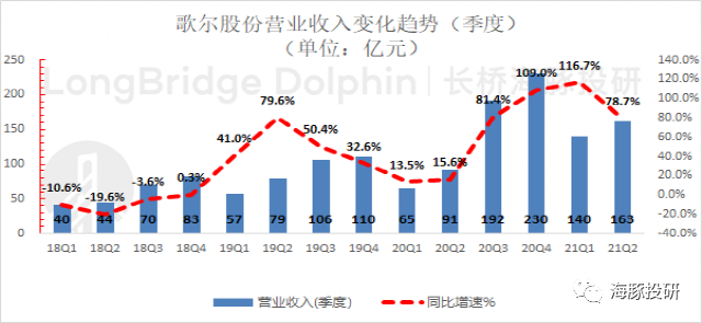 歌爾股份2021年第二季度總營收162.6億元,同比增長78.7%,超市場預(yù)期(158.8億元)。在Oculus、AirPods和PS等產(chǎn)品出貨增長的情況,公司收入規(guī)模成長迅速。