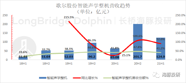歌爾股份智能聲學(xué)整機(jī)板塊2021年上半年總營收124.9億元,同比增長92%。