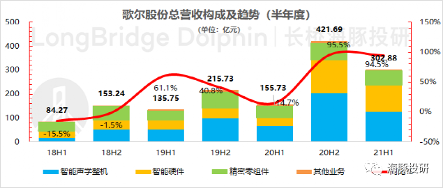 歌爾股份2021年上半年總營收302.88億元,同比增長94.5%。