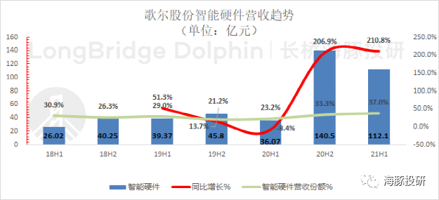 歌爾股份智能硬件板塊2021年上半年總營收112.1億元,同比增長210.8%。
