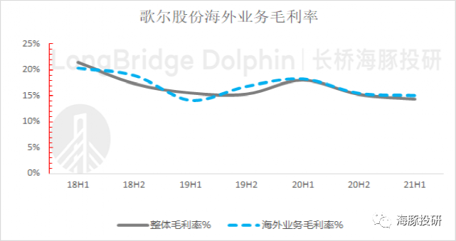歌爾股份海外業(yè)務(wù)2021年上半年毛利率15.1%,同比減少3.2pct,環(huán)比減少0.4pct。