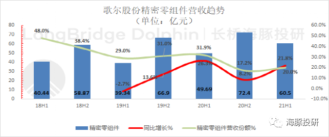 歌爾股份精密零組件板塊2021年上半年總營收60.5億元,同比增長21.8%。